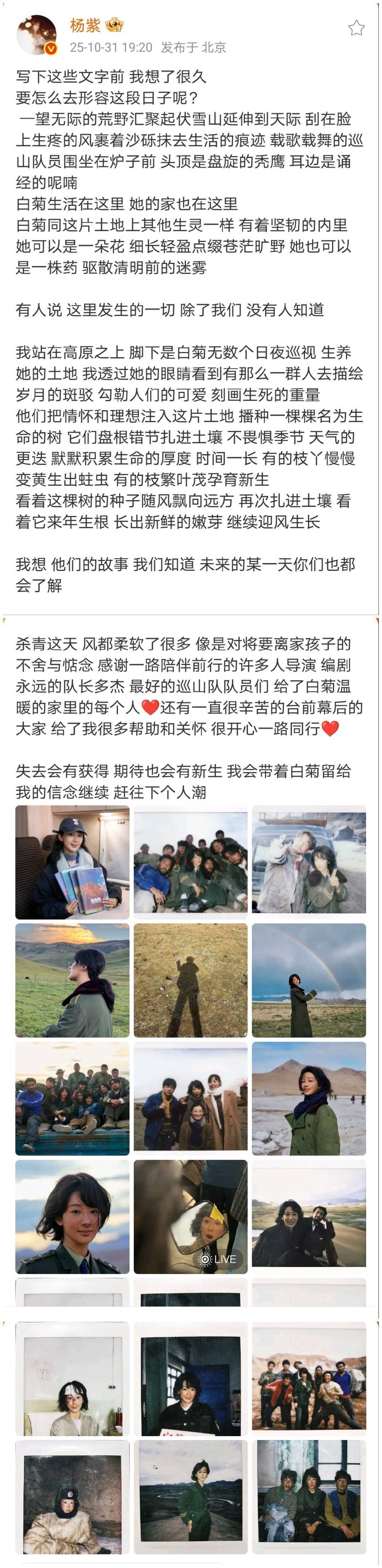 杨紫行为主演,在剧中演出巡护员白菊,为了拍好这个变装,她提前半个月就到青海体验生计,随着巡护员沿途巡山、挽救野纯真物。终了宴上,杨紫还发了长文,字里行间尽是对这片地皮的怜爱:“在青海的日子,让我显著了什么是确切的看护。这里的每一寸地皮、每一只动物,皆值得咱们用生命去襄理。”至于“失忆”的传言,其实是杨紫在采访中开打趣说“拍完这部剧,嗅觉把前半生的眼泪皆流干了,很多事皆记不清了”,后果被以文害辞传成了“离奇失忆”。