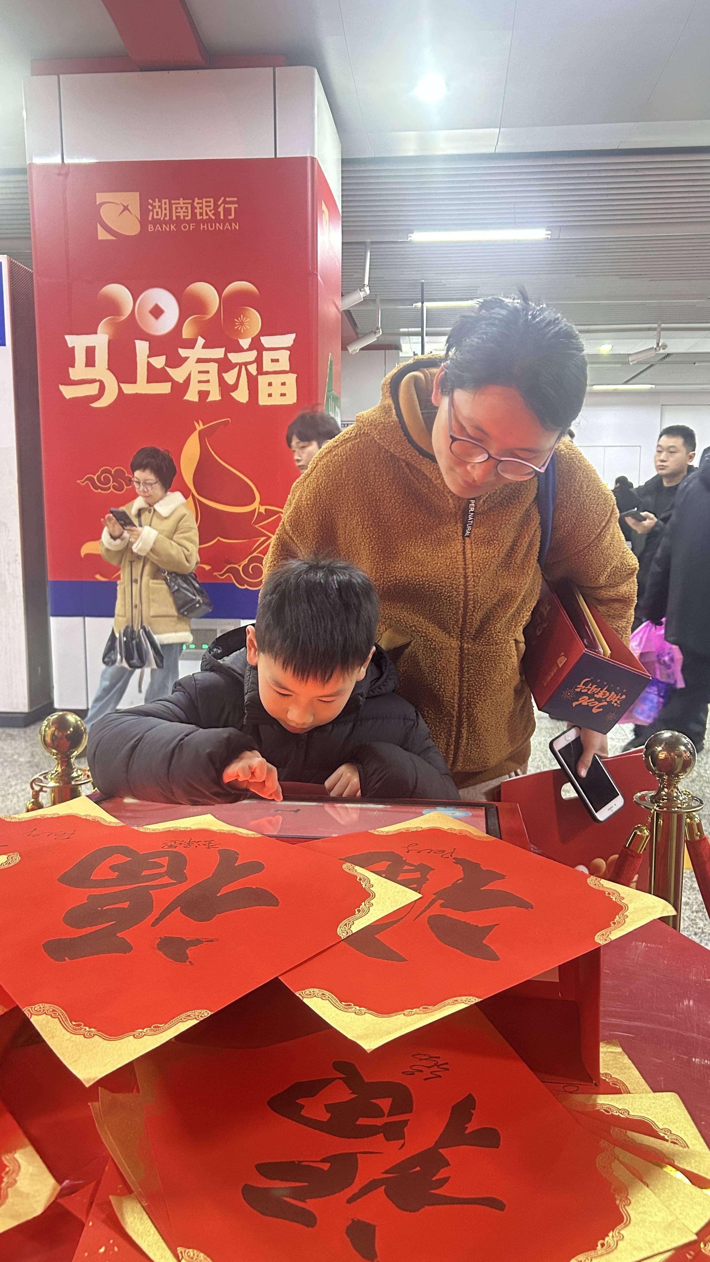 2月9日,湖南银行、中南出书集团和天闻地铁传媒,在长沙地铁侯家塘站举办了“赶紧有福”书道名家送春联活动。