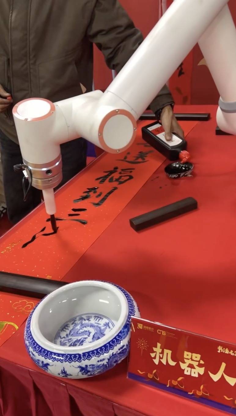 本年还有一位稀疏的“书道家”,是一个机器东谈主。责任主谈主员为其铺好纸张,提笔蘸墨挥毫,机器东谈主鸿篇巨制地完成这些手脚,乘客纷纷掏最先机纪录这科技感统统的一幕,“字写得真不输书道家。”