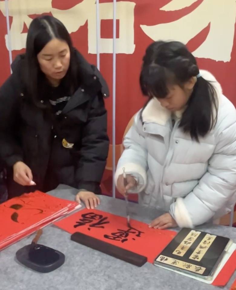 陈同学写春联时,彭女士就在一旁为她添墨压纸晾字,此次彭女士还带来了6岁的小女儿,每当姐姐完成一副春联,她齐会慷慨地拍掌,“姐姐一直齐是她的榜样。”彭女士说,他们桑梓在湖南益阳,回桑梓过年也给女儿支个摊,为长辈乡亲们写字。