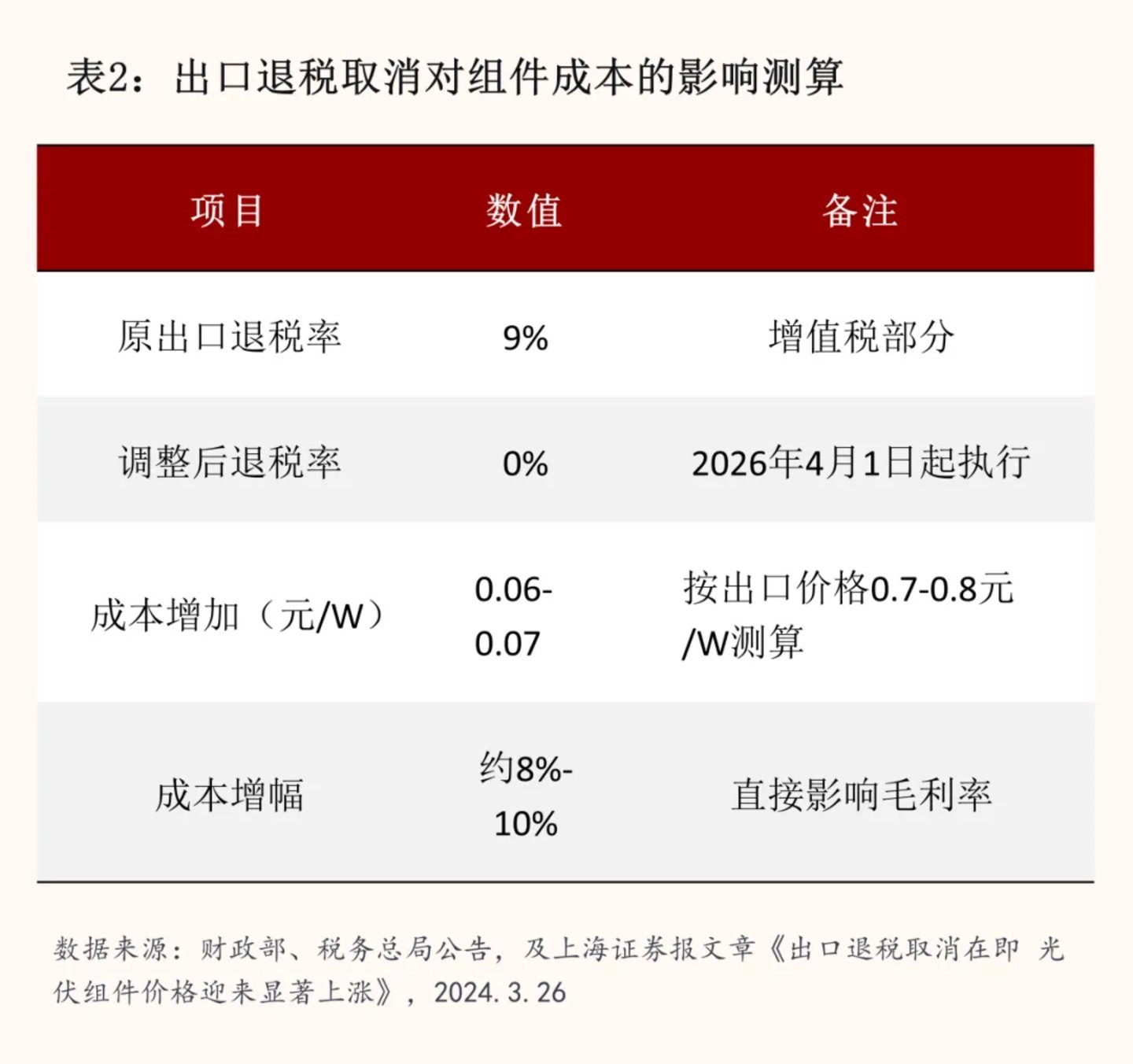 从战术端来看,出口退税取消倒逼提价。凭据财政部、税务总局公告,自2026年4月1日起,光伏家具的升值税出口退税将被取消。业内测算,取消9%的出口退税,预测将使光伏家具成本每瓦上升0.06元至0.07元。